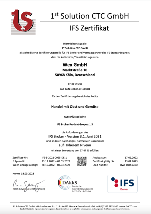 Die IFS Broker Zertifizierung steht für "International Featured Standards" und ist ein international anerkanntes Zertifizierungssystem für Unternehmen, die als Broker zwischen Lebensmittelproduzenten und -händlern tätig sind. Das Zertifikat bescheinigt, dass ein Unternehmen bestimmte Anforderungen an Qualität und Sicherheit erfüllt und eine kontinuierliche Verbesserung seiner Prozesse sicherstellt. IFS Broker soll sicherstellen, dass die Qualität und Sicherheit von Lebensmitteln entlang der gesamten Lieferkette gewährleistet wird.